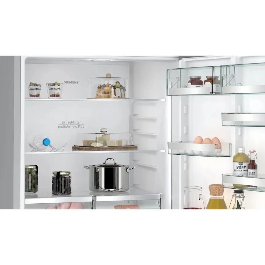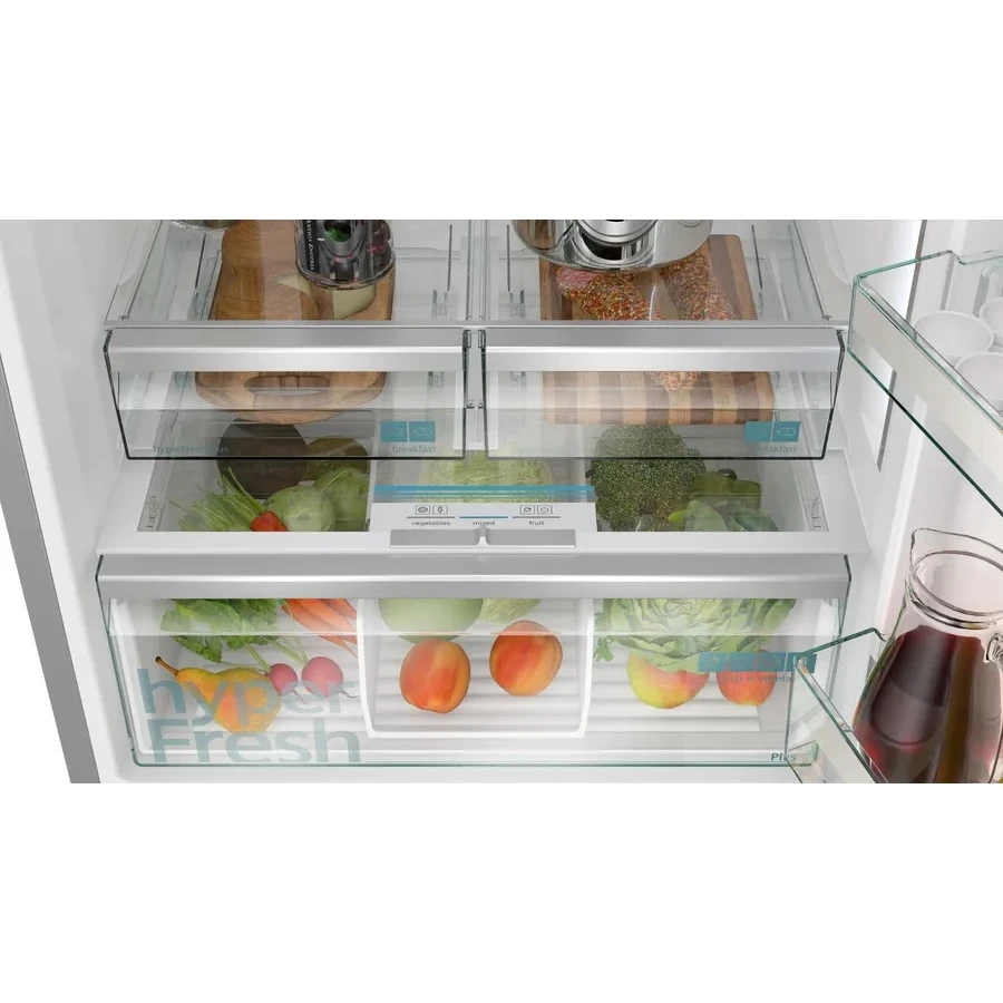 Технология Multi Air Flow обеспечивает равномерное распределение холодного воздуха, поддерживая оптимальную температуру на всех уровнях. Особая зона свежести, а также функции суперохлаждения и быстрой заморозки позволяют сохранять продукты свежими и полными витаминов на длительное время. Дополнительные возможности, такие как Home Connect, varioZone и hyperFresh, делают эксплуатацию холодильника еще более удобной и эффективной.