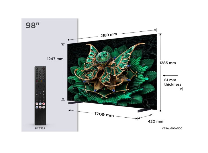 У TCL 98C7K также сильная аудиосистема, издающая хорошую громкость и качество звука прямо с телевизора. Смарт-платформа на базе Google TV позволяет непосредственно получать доступ к стриминговым сервисам, управлять голосом, использовать новые функции гейминга и имеет четыре входа HDMI 2.1 для подключения игровых консолей или других передовых устройств.
