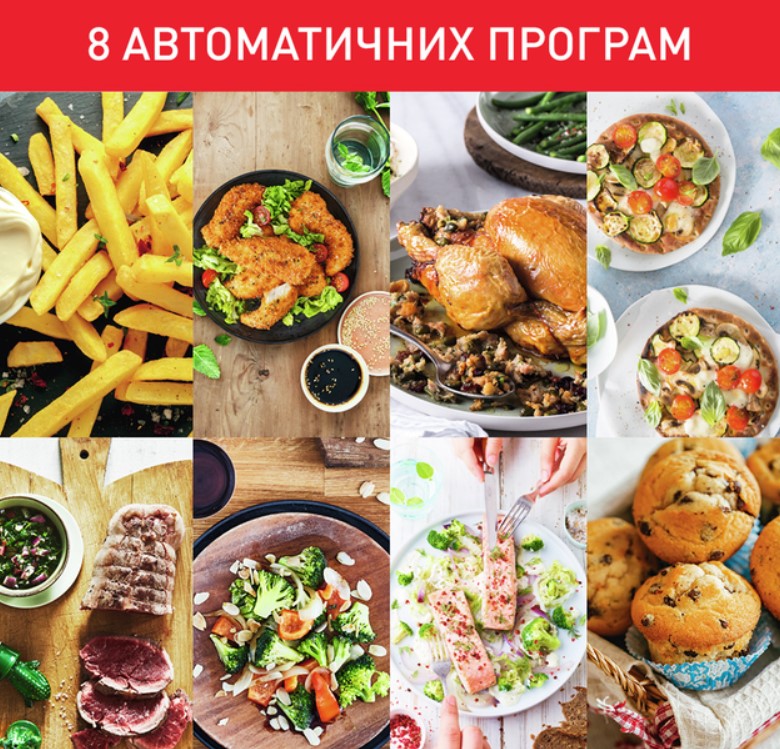 | Режимы и функции духовки | картофель фри, курица, нагетсы, рыба, мясо, пицца, овощи, десерт, +2 ручных режима: аэрофритюр и гриль |