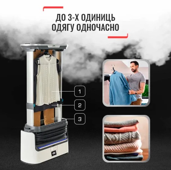Модель поддерживает несколько режимов работы – от быстрого освежения до полного цикла санитизации – что позволяет адаптировать обработку под тип ткани или уровень загрязнения. Для комфортного использования предусмотрены такие решения как съемный водяной бак, подвижная стойка, компактное хранение и управление через дисплей или пульт.