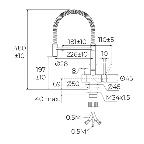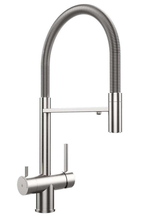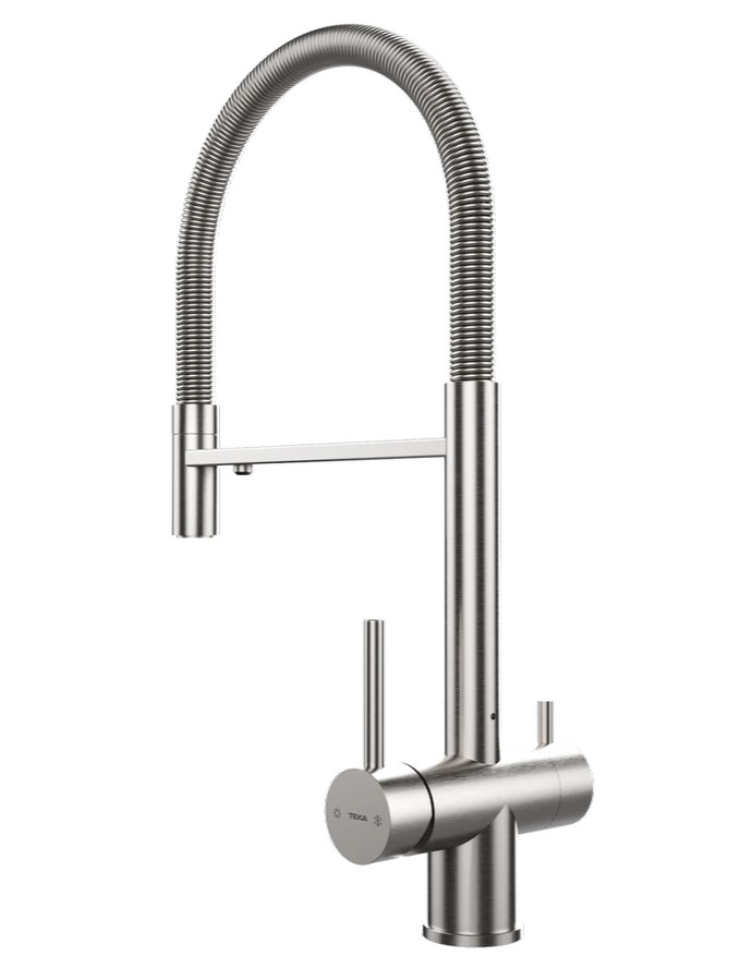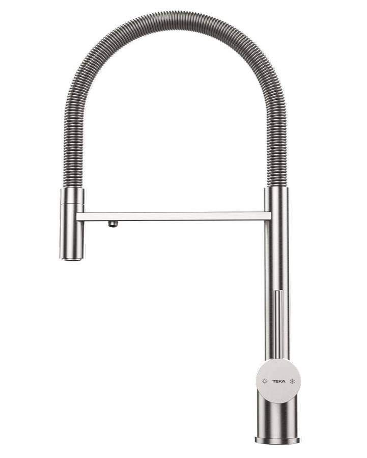 Teka UNI 3913 – профессиональный кухонный смеситель 2 в 1 с высокой гибкой воронкой, созданный для современной кухни, где важны комфорт, функциональность и длительный срок службы. Этот смеситель изготовлен полностью из высококачественной нержавеющей стали (AISI 304), что обеспечивает прочность, коррозионную стойкость и гигиеничность в условиях ежедневного использования. Он имеет поворотное излив, которое дает полную свободу движения и позволяет легко заполнять большие кастрюли или мыть большие предметы. Особенностью модели является система двойного потока воды: можно переключаться между нефильтрованной и фильтрованной водой, если подключить собственную систему фильтрации под мойкой (фильтр в комплект не входит). Эко-аэратор с защитой от накипи ограничивает расход воды до 5 л/мин, что способствует экономии воды и энергии без ущерба для эффективности.