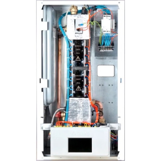 Сенсорное управление режимом работы производится непосредственно на дисплее котла с диагональю 5 дюймов. При работе котла отображаются текущие значения температуры воздуха и теплоносителя. Благодаря встроенному модулю Wi-Fi можно не только контролировать текущее состояние настроек режима работы, но и управлять котлом из любой точки мира. Через интернет процессор котла синхронизируется с сервером настоящего времени и получает новые обновления программного обеспечения производителя. Детали корпуса выполнены из высококачественной стали и подвергнуты антикоррозионной обработке. В последствии на них нанесена порошковая краска для создания защитного слоя и придания красивого внешнего вида.