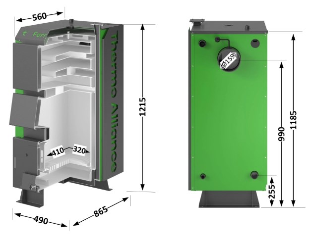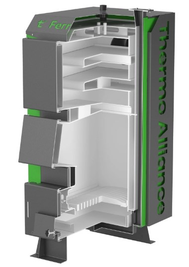 Твердотопливный котел Thermo Alliance Ferrum Plus FSF+ 14 работает с высоким коэффициентом полезного действия и может обеспечить теплое помещение площадью до 140 м². Высокий показатель КПД достигается за счет многоканального теплообменника с большой площадью. Стальной водогрейный котельный агрегат оборудован колосниковой решеткой из чугуна и предусматривает ручную загрузку топлива: дров, каменный уголь, брикеты. Теплоизоляция стен – минеральная вата толщиной 5 см.