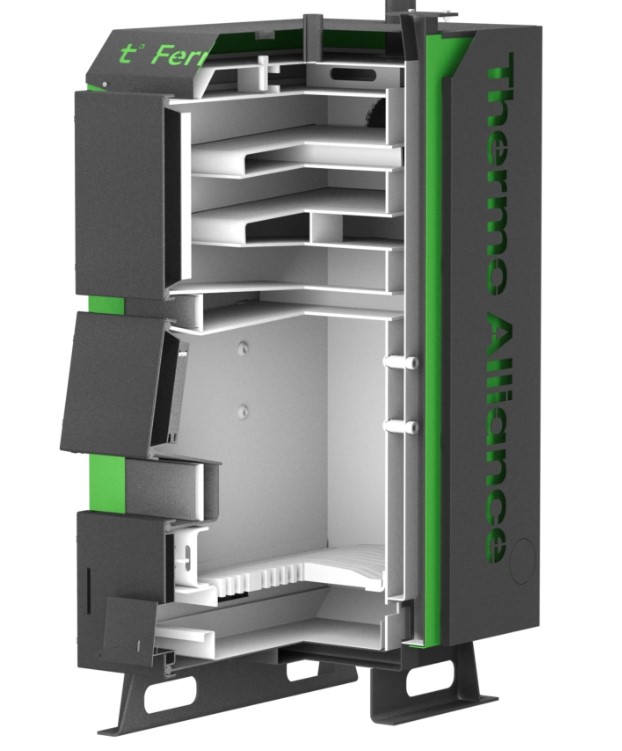 Твердотопливный котел Thermo Alliance Ferrum Plus FSF+ 16 работает с высоким коэффициентом полезного действия и обеспечивает теплое большое помещение. Высокий показатель КПД достигается за счет многоходового теплообменника с большой площадью. Стальной водогрейный котельный агрегат оборудован колосниковой решеткой из чугуна и предусматривает ручную загрузку топлива: дров, каменный уголь, брикет. Теплоизоляция стен – минеральная вата толщиной 5 см.