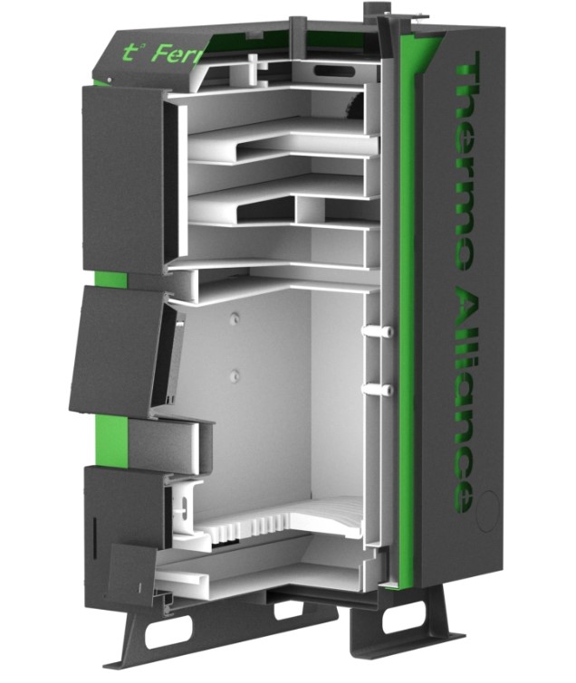 Твердотопливный котел Thermo Alliance Ferrum+ FSF+ 20 работает с высоким коэффициентом полезного действия и может обеспечить теплое помещение. Высокий показатель КПД достигается за счет многоходового теплообменника с большой площадью. Стальной водогрейный котельный агрегат оборудован колосниковой решеткой из чугуна и предусматривает ручную загрузку топлива: дров, каменный уголь, брикет. Теплоизоляция стен – минеральная вата толщиной 5 см.