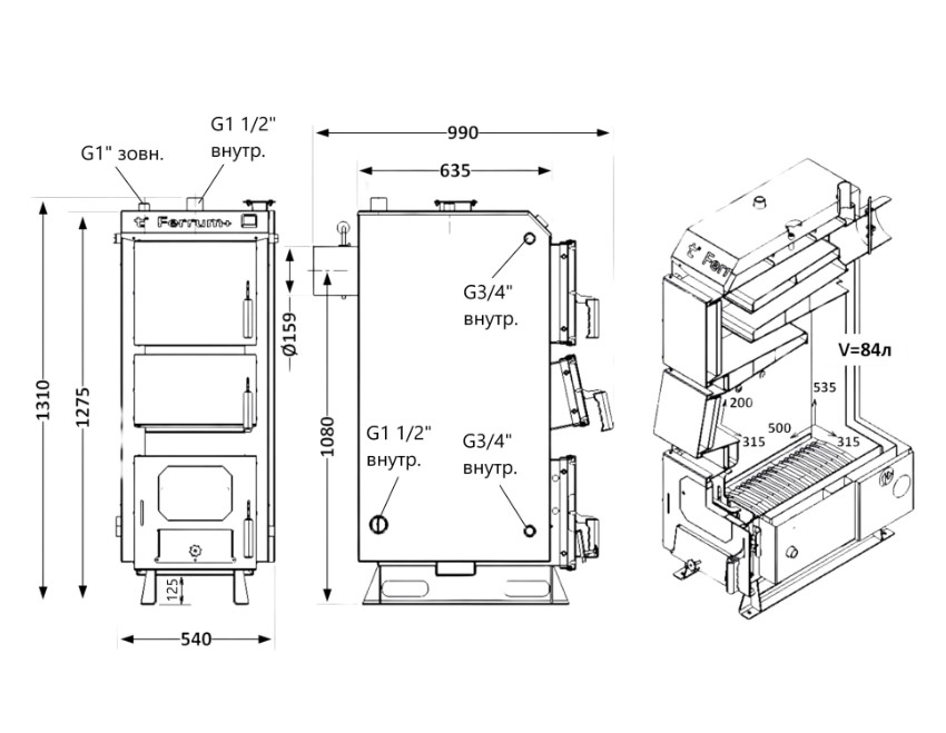 | Патрубки подключения котла, (") | 3/4 |