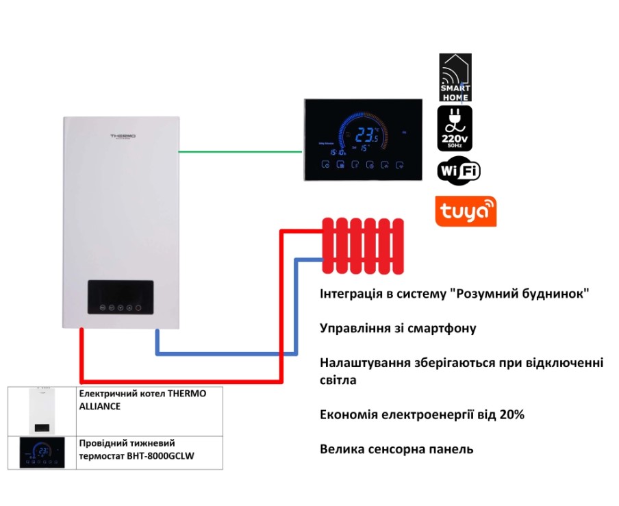 Набор 2 в 1 Thermo Alliance: электрический котел 12 кВт и проводной термостат Wi-Fi представляет собой комплексное решение для эффективного управления системой отопления. Электрокотел мощностью 12 кВт обеспечивает надежное и стабильное отопление средних и больших помещений, термостат с поддержкой Wi-Fi позволяет удобно контролировать температуру и удаленно настраивать режимы работы котла. Этот набор способствует повышению комфорта и экономии энергоресурсов, делая процесс отопления более удобным и энергоэффективным.