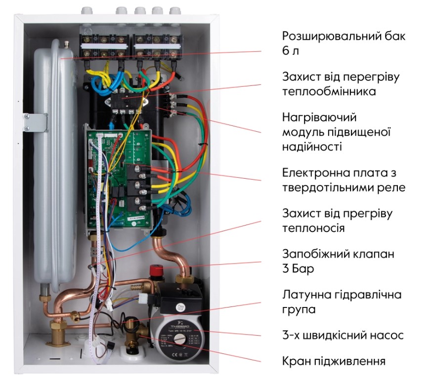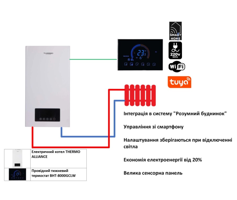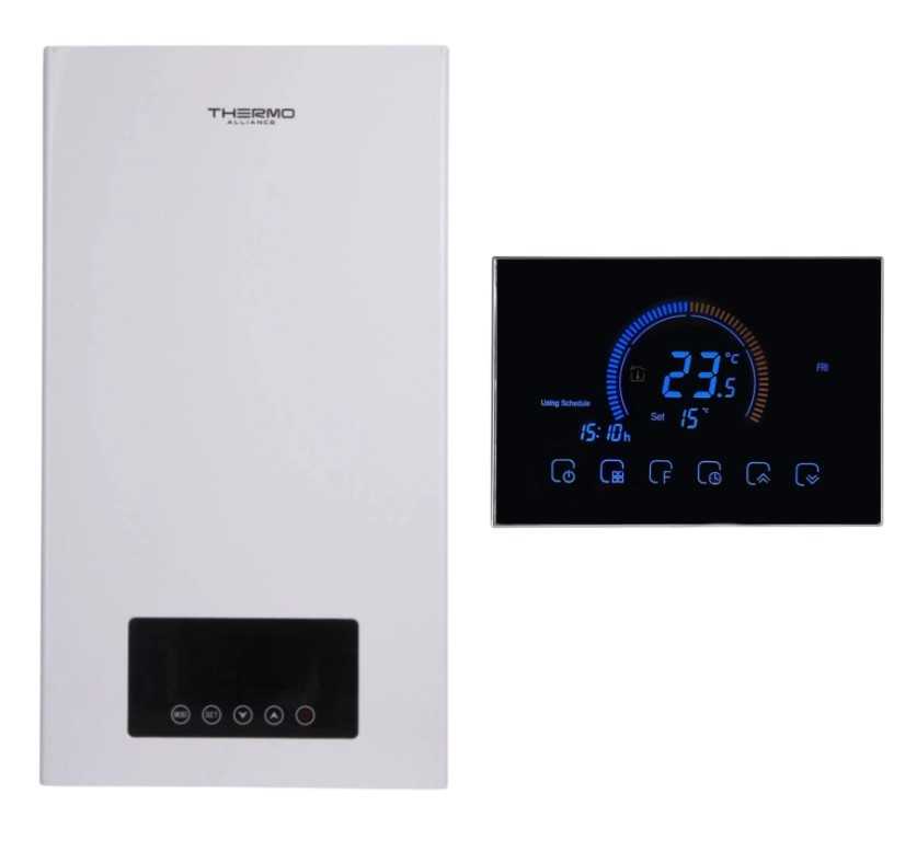 Набор 2 в 1 Электрокотел и программатор TA149DCN847153 представляют собой комплект для эффективного управления отопительной системой. Электрокотел TA149DCN8 мощностью 8 кВт обеспечивает надежное и стабильное отопление, а BHT-8000GCLW позволяет удобно контролировать температуру и настраивать режимы работы котла. Этот набор подходит для отопления среднего размера помещений, обеспечивая комфорт и экономию энергоресурсов. Настенный электрический котел Thermo Alliance 8 кВт предназначен для нагрева отопительной воды с принудительной циркуляцией в системах отопления при избыточном давлении воды до 3,0 бар. Основной частью котла есть теплообменник из алюминиевого сплава с интегрированными нагревательными элементами. Котел оборудован циркуляционным насосом, блоком управления и другими регулировочными и защитными элементами. Корпус котла оснащен надежной термоизоляцией.