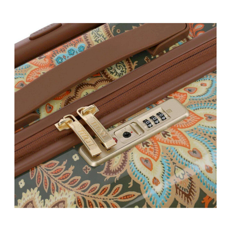 Внутри на откидной крышке отделение на молнии и стягивающие ремни. Верхняя и боковая ручка для удобной переноски. Выдвижная ручка на кнопке имеет два положения фиксации. Встроенный кодовый замок TSA. Прорезиненные колеса.