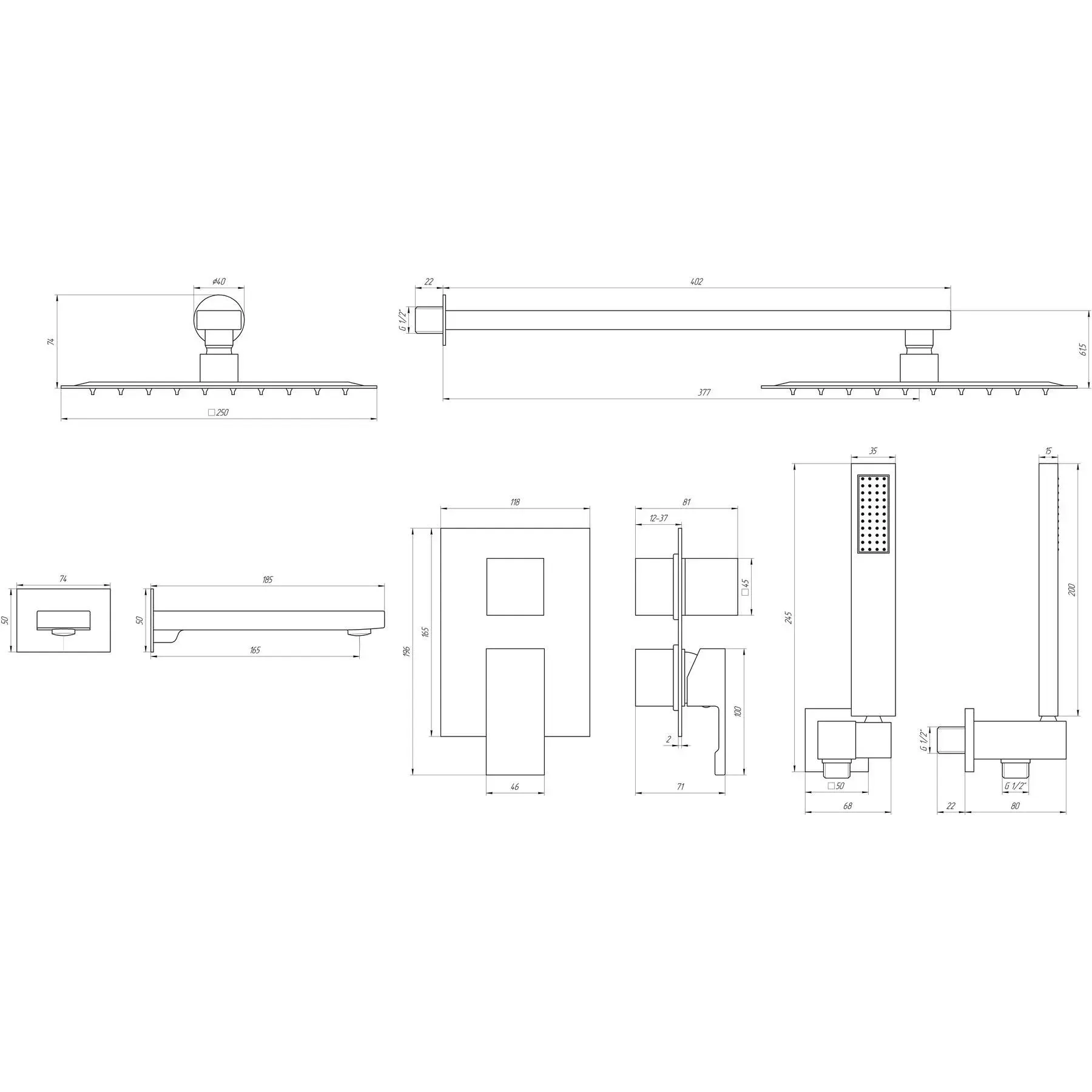 | Комплектация | верхний душ, кронштейн, ручной душ, душевой шланг, держатель душа, смеситель, излив |