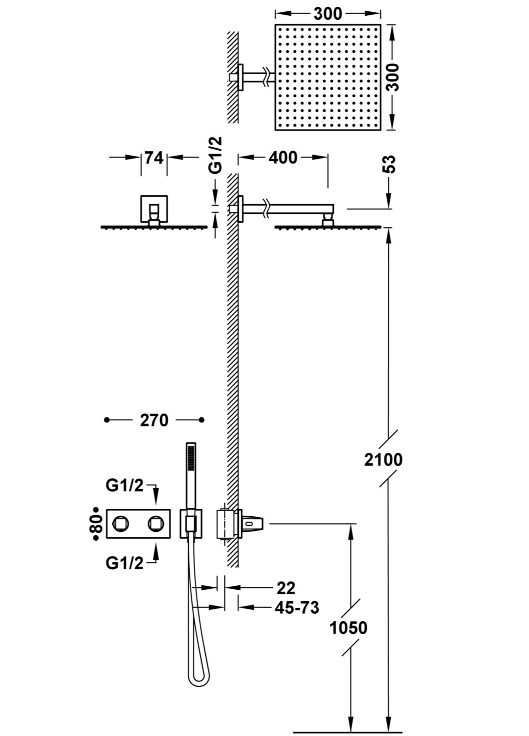 Система оснащена термостатическим смесителем, поддерживающим стабильную температуру воды даже при перепадах давления. Технология Tres Instant обеспечивает быструю реакцию термостатического картриджа, благодаря чему подается вода с постоянной температурой и комфортным напором. Управление осуществляется керамическим двухканальным переключателем, позволяющим переключать подачу воды между разными источниками – например, верхним и ручным душем.