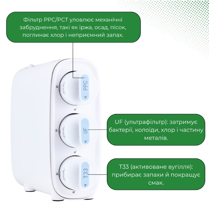 UF – ультрафильтрационный модуль (не ультрафиолет; замена 12–18 мес.): задерживает микрочастицы, коллоиды, бактерии и цисты; может уменьшать количество некоторых вирусов, но не гарантирует их полное удаление. UF не предназначен для уменьшения TDS/фторидов/ионов тяжелых металлов – для этого требуется обратный осмос (RO).