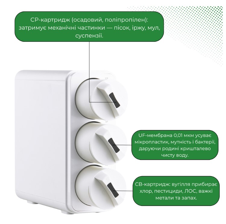 UF — ультрафильтрационный модуль (не ультрафиолет; 12–18 мес.): микрочастицы, коллоиды, бактерии, цисты.
