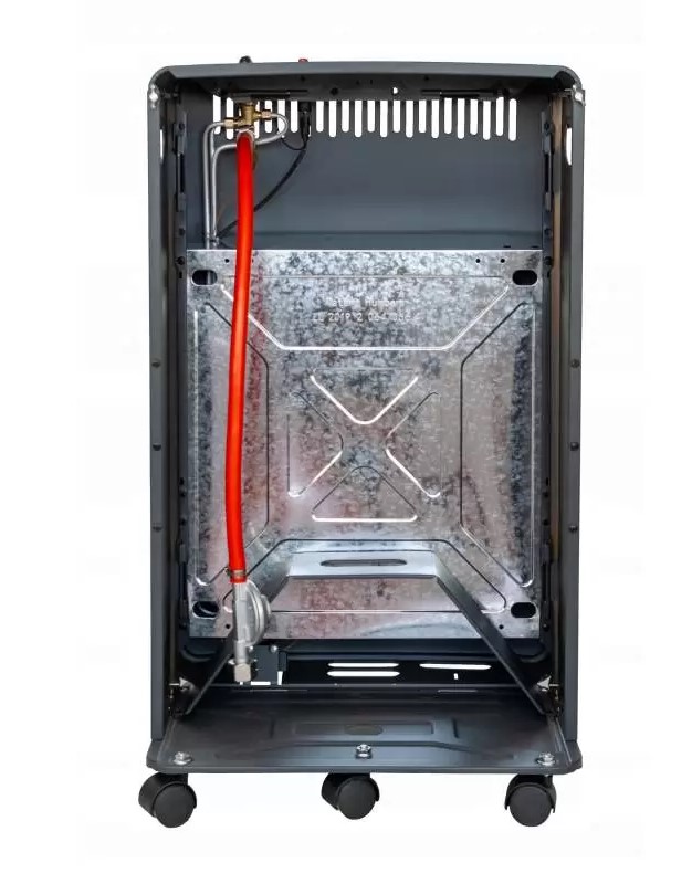 Корпус выполнен из металлических материалов, что обеспечивает долговечность и стойкость к механическим нагрузкам. Устройство оборудовано системой безопасности с выключением подачи газа при избытке CO2 или при наклоне, что повышает безопасность эксплуатации. Пьезорозжиг позволяет легко запускать обогреватель без внешних источников огня. Эта модель способна обогревать площадь до 60 м2, что делает ее подходящей для использования в гаражах, мастерских, дачных домиках или полуоткрытых террасах. Конструкция предусматривает подвижность и удобство перемещения, а при необходимости обогреватель легко транспортируется благодаря колесикам и ручкам.
