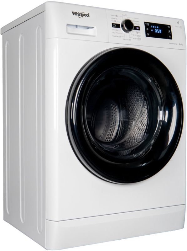 Стирально-сушильная машина Whirlpool FWDG86148B EU в белом цвете с черной дверной рамой относится к классу энергопотребления A