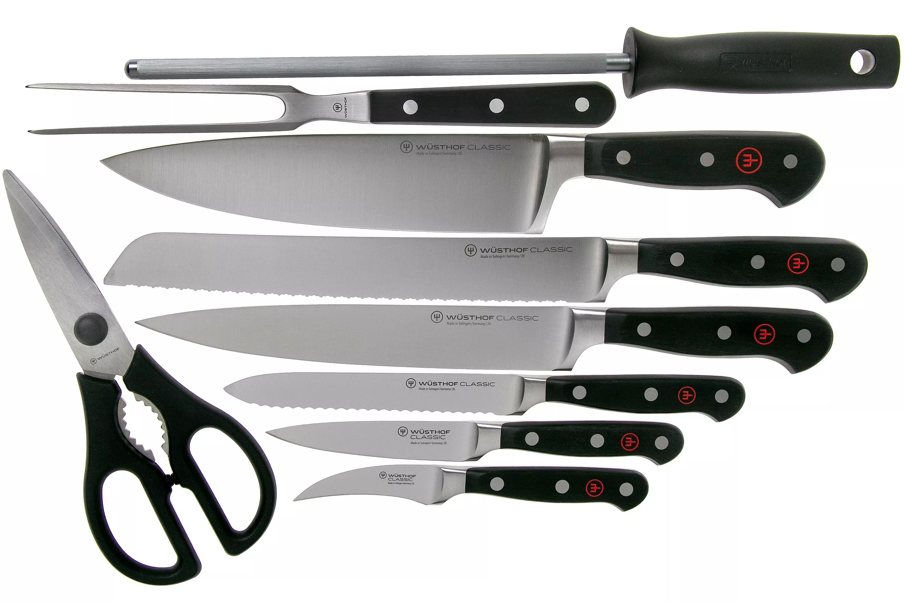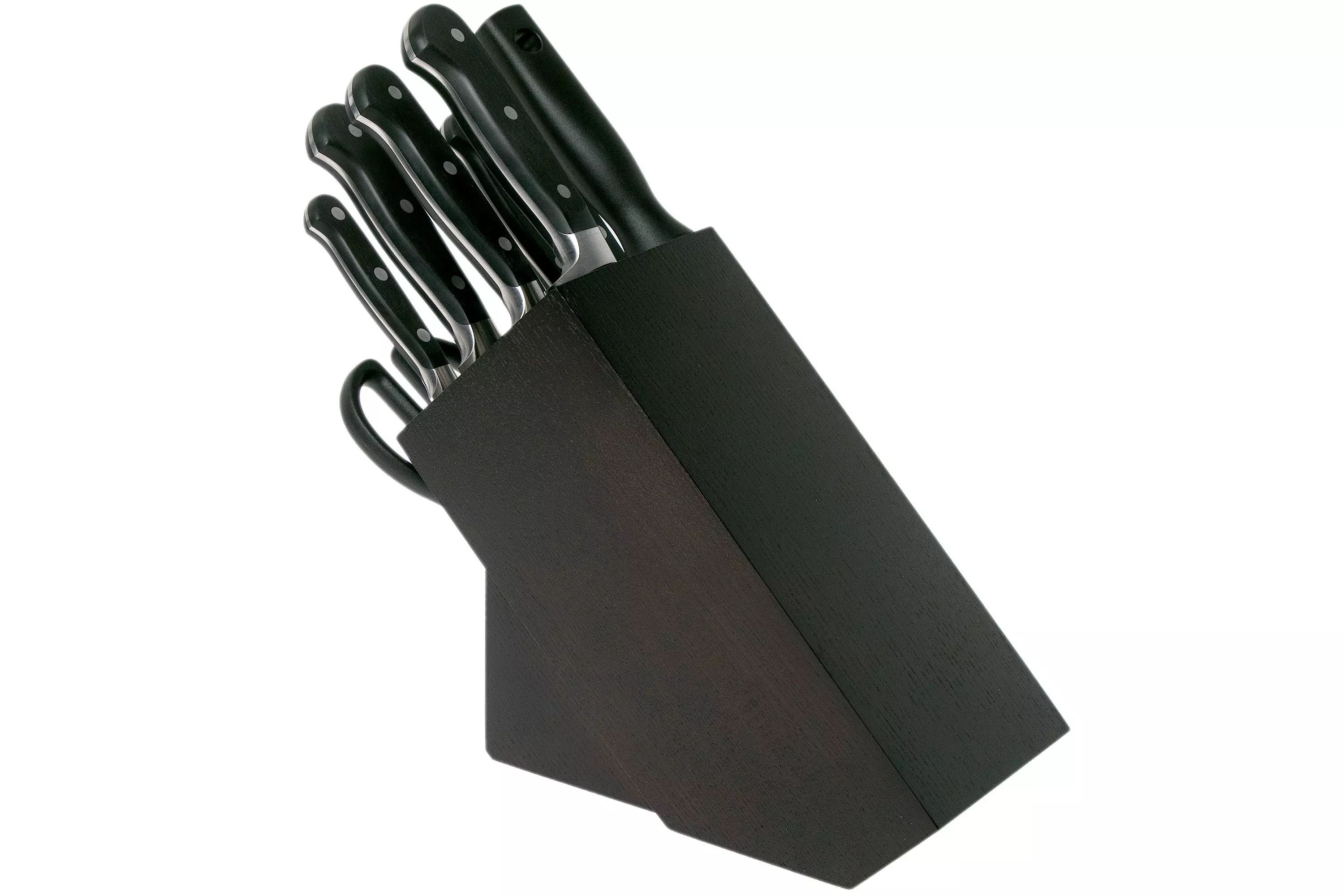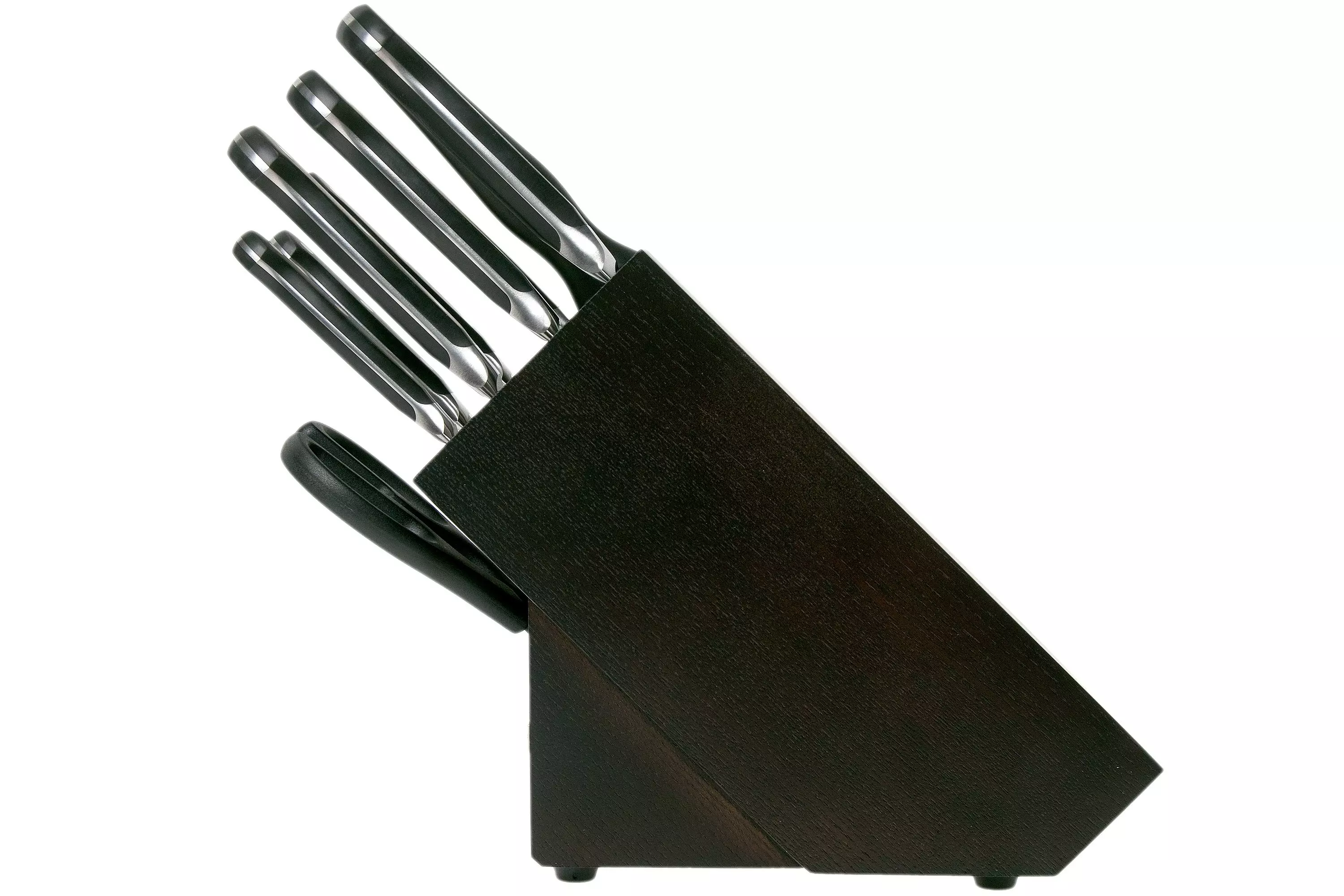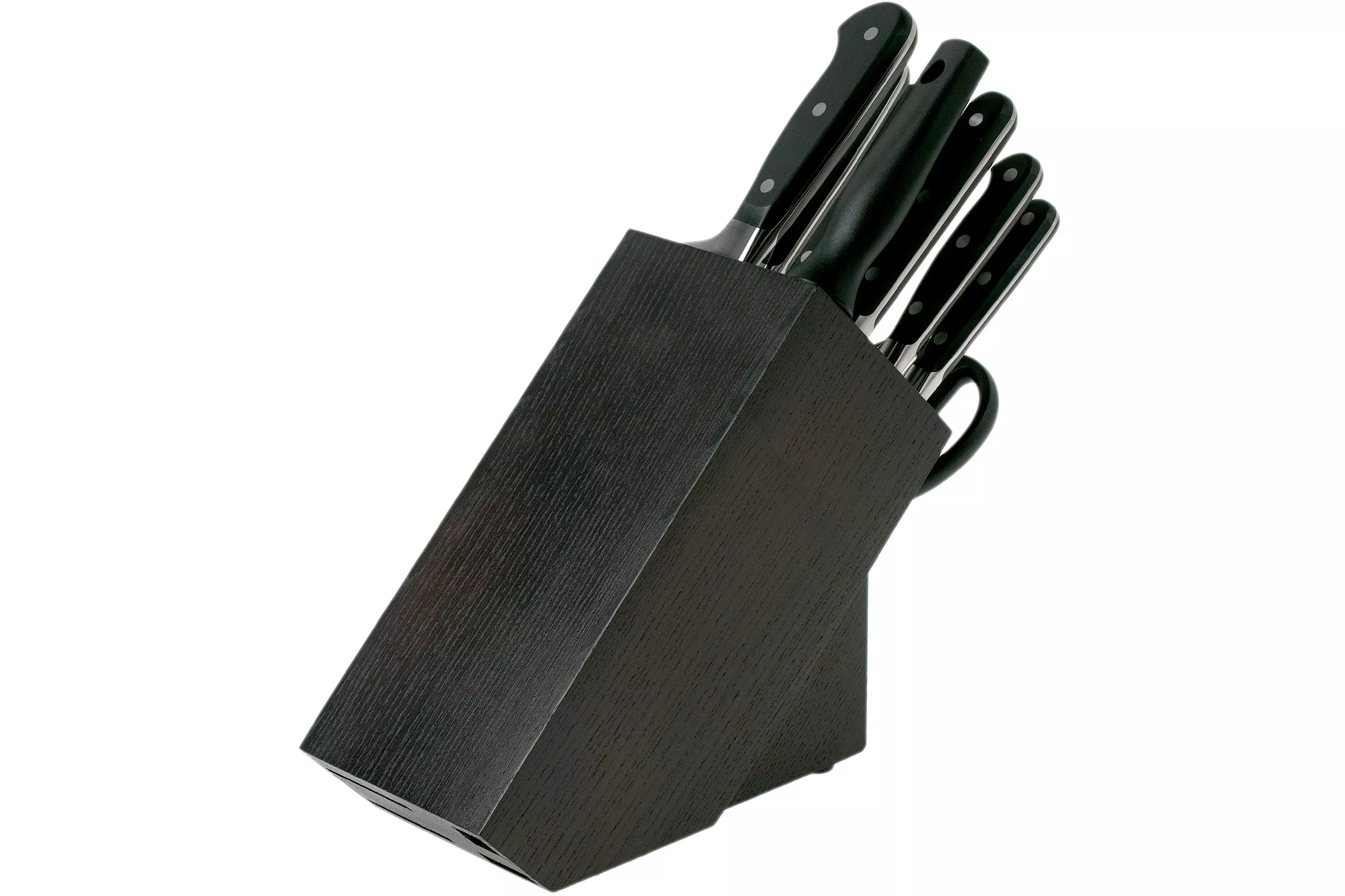 | Комплектация | Блок. Нож для очистки; нож для очистки и нарезки; нож для томатов и нарезания твердых продуктов; нож для хлеба; разделочный нож; нож шеф-повара; вилка для мяса; ножницы. |