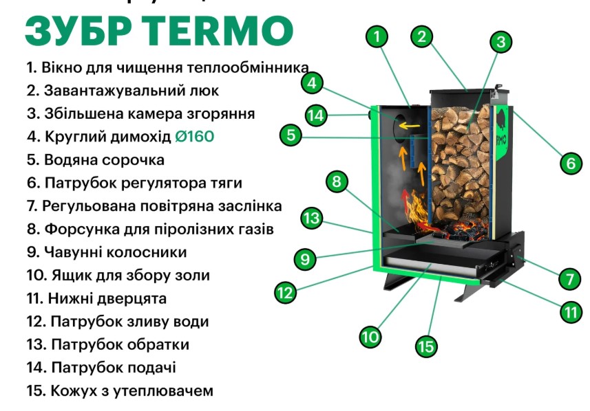 ZUBR Termo – это твердотопливный котел, предназначенный для обогрева частных домов, коттеджей, дачных построек или хозяйственных помещений площадью. Модель от бренда ZUBR сочетает в себе практичность, надежность и простоту эксплуатации, что делает ее оптимальным решением для систем отопления без доступа к газовой сети или сложной автоматизации. Котел работает на твердом топливе (дрова, уголь, брикеты), а эффективная конструкция сгорающей камеры обеспечивает стабильную теплоотдачу и длительную работу при одной загрузке.